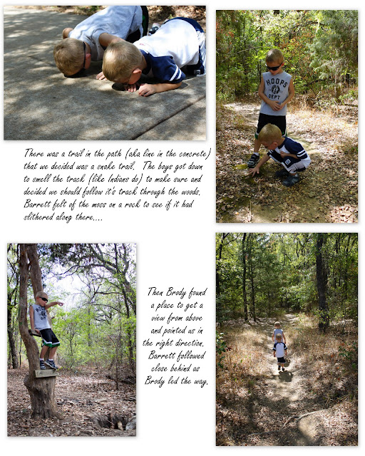 Yesterday the boys and I had a picnic at the park after my women's Bible study at church. After eating and playing on the playground, we decided to go for a walk on the trails. We hadn't been to this park before and were excited to learn that not only was there a paved walkway, but there were also lots of trails through the woods and lots of reserved nature areas! It was a beautiful walk...